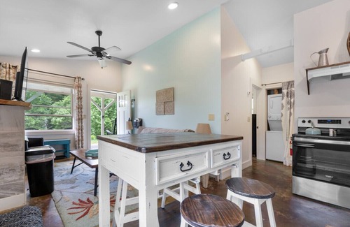 This nicely decorated one bedroom cottage features and open living room with a gas log fireplace, dining area and full kitchen, a cozy queen bedroom and covered front porch. The private portion of the yard at Clementine's Cottage has a hot tub, grill and fire pit to enjoy quiet evenings under the stars. The porch overlooks the common grounds, which are shared with two other Doe Creek Cottages. Explore the 13 plus acres of land, paddle out on the large pond or enjoy a fire in the fire pit.