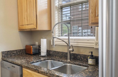 Blue Bird Hideaway is nestled on the Indian Point peninsula of Branson, an especially popular location for its many marinas, campgrounds, bars, restaurants, and proximity to Table Rock Lake and Downtown Branson. Another of Branson’s top attractions, the 61-acre amusement park Silver Dollar City, is so close you’ll have views of its tallest rides from this property. Inside Blue Bird Hideaway, you’ll be immediately welcomed by a neutral-toned design and open concept layout filled with natural light. Relax and unwind in the living room with seating arranged around an electric fireplace and smart tv. Seamless indoor to outdoor living will be a theme of your trip, both as you explore and as you hang at home, with additional lounging space just off the living room on an outdoor, covered patio.