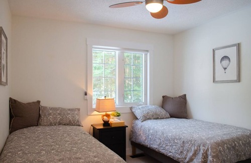 The west wing of the cottage is made up of 2 bedrooms - one with two twins and the primary suite featuring a king bed and single bunk beds. This is the perfect hideaway for a young family with your own deck access, a desk with a beautiful view if you really need some quiet time to catch up with the office and plenty of floor space for a pack-n-play or bassinet along with the bunk beds. There is even a massive ensuite. This will be the room that your friends try to claim first!