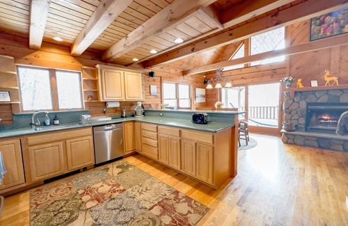 This stunning Eastern White Pine Log Chalet features 3 bedrooms, 2 full bathrooms, a large living/dining area, and a massive covered deck with breathtaking views, providing ample space for friends and family. The house comfortably sleeps 8 people (6 adults and 2 kids).
