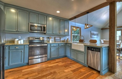 Fully equipped kitchen with stainless appliances, granite countertops, and all the tools you need — including a French press, Keurig (with K-cups provided), blender, toaster, and BBQ utensils for the charcoal grill on the porch (guests provide charcoal)