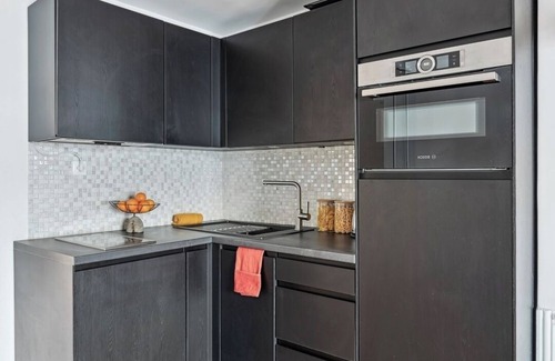 The kitchen is fully equipped with a sink, toaster, electric tea kettle, refrigerator, stove, microwave with oven, and Nespresso coffee machine. Complete sets of dishes, cutlery, pots, pans, and utensils are provided. The apartment also includes a combination washer and dryer, along with an iron, ironing board, vacuum, mop, and broom for your convenience.