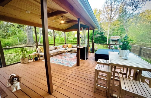 Enjoy all the seasons on our newly built covered back deck, featuring a large outdoor living room with ceiling fan, a luxury 6-person Sundance hot tub with therapeutic jets, and a separate dining area. Built-in Bluetooth speakers with recessed lighting in vaulted ceiling. Large fully fenced backyard with fire table. Gorgeous views of large open field and wooded area.