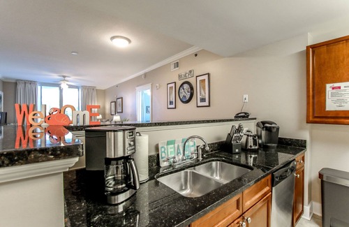 This popular condo books up fast! Families love the ground floor convenience and easy access to the courtyard pools...just walk outside! Condo has just had a makeover with 2 new King bedroom sets including beds, dressers and nightstands. New living room Queen sleeper sofa and loveseat are fresh and fun. Painted in cool beachy colors and coastal decor, A110 features 2 King beds, bunk room complete with bunk door plus 2 flatscreen TV's. The living room boasts a 50' flatscreen, comfortable seating plus queen sleeper sofa! The open floor plan of this two bedroom unit allows every room to lead onto a spacious balcony with outdoor seating. The condominium's kitchen is well appointed with granite countertops, stainless steel appliances, and beautifully tiled floors. All dishes, new cooking utensils, and bake ware are provided to complete and serve meals. The dining area has a large table with seating for 8 people. The open living room houses a queen sofa sleeper, flat screen TV, and DVD player. Just off of the main hallway near the bunk room is a convenient powder room. The master bedroom features a king bed, private bath with stand up shower, garden tub, flat screen TV, and DVD player. The second bedroom includes a king size bed, private bath with wider door frames, shower bars, pedestal sinks and stand up shower. bunk with stand up shower and garden tub, flat screen TV, and DVD player. There is a stackable washer/dryer included in the unit for your convenience. This unit is handicap accessible and offers wider door frames, shower bars, pedestal sinks, and lower counters.