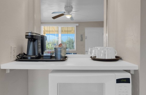 Come visit our small authentic desert motel with large and refreshing swimming pool. Walk to restaurants and shopping in "downtown" Borrego Springs . Visit Anza Borrego State Park (the largest state park in the United States) and view the starry night sky from our patios and pool deck. Borrego Springs is a recognized International Dark Sky Community and our motel is solar powered and eco-friendly! Each unit will accommodate up to two people. Seven of our rooms have a queen size bed. The eighth room has two twin beds and connects via an interior door to a queen bed unit as well as having its own exterior door. Two of our queen bed rooms are pet friendly (extra fee) while the remaining rooms are kept pet free.. All rooms have a microwave, small refrigerator,Keurig style coffee maker with good coffee!, bistro table & chairs, nightstands with lamps, heater, air conditioner, overhead fan with light. Park in front of your room. We have a Level 2 EV charger for your EV! 1 1/2 blocks to Christmas Circle (center of town). Free high speed internet is available in each room. No TV to interfere with your relaxation but bring your streaming device if you need to stay connected. No smoking. No resort fee. Quiet & serene. Enjoy the desert air, listen to the birds chirp and the coyotes howl! Enjoy our big pool in the warmer months, relax and enjoy a book or the sights and sounds of our desert community.