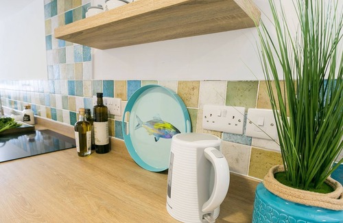 Well equipped galley kitchen with induction hob and full-size electric oven, microwave, fridge freezer (3 drawers), cafetiere, dishwasher and washer/dryer, iron and ironing board.