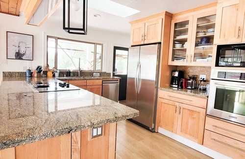 The open concept kitchen is a fun gathering place to whip up some truly epic meals. We have a blender, drip coffee, Nespresso machine, coffee grinder, hot water kettle, air fryer and toaster.