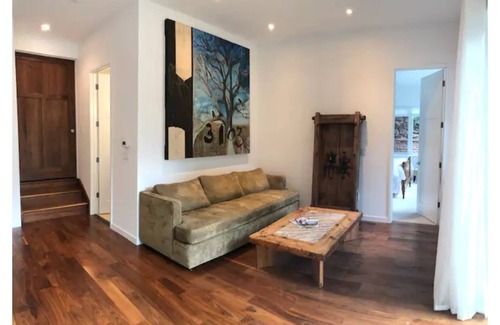 This award-winning energy-conscious home has been featured in local green building, art, and garden tours, a modern gem nestled in a historic neighborhood of grand homes. The 1100 square foot guest suite has two generous bedrooms, private full bathroom, and a spacious lounge and dining area, all heated and cooled with an in-floor system. One of the bedrooms doubles as a private theater with overhead projector to show DVDs or streaming services. The light-flooded space was designed to integrate into the garden area, about a quarter acre of vegetable and flower beds, grassy lawn, and natural woodland flanking a seasonal creek.