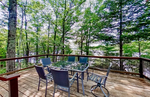 This lakefront beauty enjoys an extensive lake-view deck, equipped with an outdoor dining area, plenty of seating, and a gas grill - the perfect spot for summertime cookouts! A lakefront firepit offers an unbeatable site to enjoy the views while roasting s'mores. Inside, the main living space is located on the second floor, with a spacious open floor plan. Wind down in the inviting living area, furnished with comfy seating, plenty of books and board games, and a smart TV. The open kitchen has all the essentials to prepare delicious homemade meals and treats for the group, so don't hesitate to channel your inner chef and surprise them with their favorite recipes. This floor enjoys one bedroom as well. The first level offers a welcoming living area with beautiful seating and two additional bedrooms. Extra perks include three kayaks, two canoes, and two paddleboards.