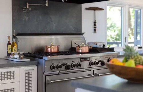 The villa blends high design with relaxed wine country living. A wraparound terrace offers sweeping views of the vines, olive trees, and fruit orchards. The chef’s kitchen features a six-burner range, large refrigerator, Nespresso machine, and everything you need to cook and entertain in style.