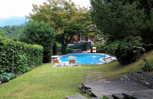 Single-family house "Bramati", 2 storeys, detached. 1.8 km from the centre of Porto Valtravaglia, 8 km from the centre of Luino, on a slope, residential area (villas), 1.8 km from the lake, in a cul-de-sac. Private: property 3'000 m2 (fenced), terraced garden lawn and wildlife garden, swimming pool kidney shaped (11 x 5 m, seasonal availability: 13.May. - 23.Sep.). Parking on the premises. Supermarket 1.8 km, bus stop 750 m, railway station "Porto Valtravaglia" 2.5 km, pebble beach "'Ai Corti'" 1.8 km. Marina 1.8 km. Please note: car recommended. Railway line 150 m from the property. The pool area is accessed via a staircase.