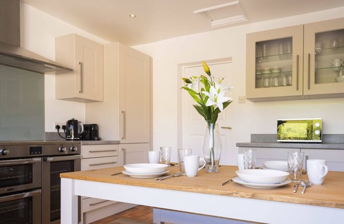 Well-appointed kitchen with cutlery, plates, bowls, mugs for tea and coffee, glasses, pots & pans, chopping board and cooking essentials