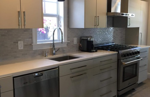The gourmet chef's kitchen features high end appliances including a gas range, Miele dishwasher and a Summit refrigerator w/ ice maker, beautiful quartz countertops, an eating island, and a Nespresso machine for your morning brew!
