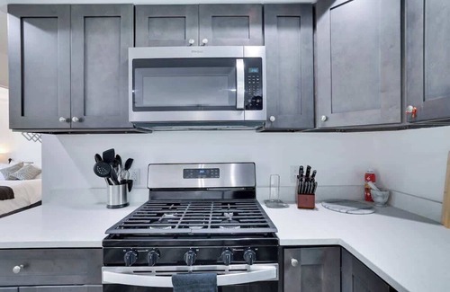 The modern kitchen is located right off of the main living area and is loaded with all-new stainless steel appliances & a coffee station (including a Keurig & coffee pods).