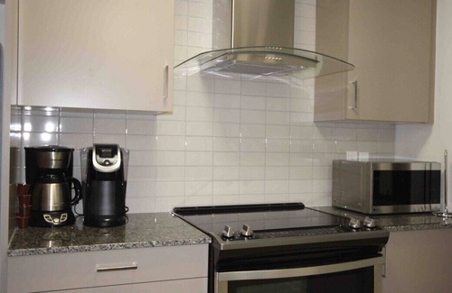 The kitchen is equipped with brand new appliances and has everything you need.