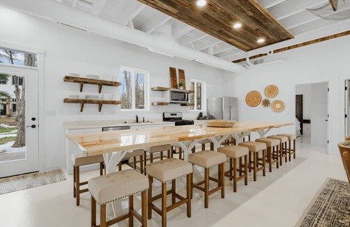 This spacious home comfortably accommodates up to 16 guests. The main level features four bedrooms and two bathrooms, along with a massive custom island that seats the whole group—perfect for shared meals or morning coffee. There's also a dining table for 8 and a cozy living room with three couches, two accent chairs, and more space to unwind.