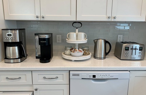 • Well stocked modern kitchen with gas range 4 burner with griddle, full size fridge and freezer, dishwasher, stand alone ice maker, air fryer, coffee machine, toaster, blender, electric kettle