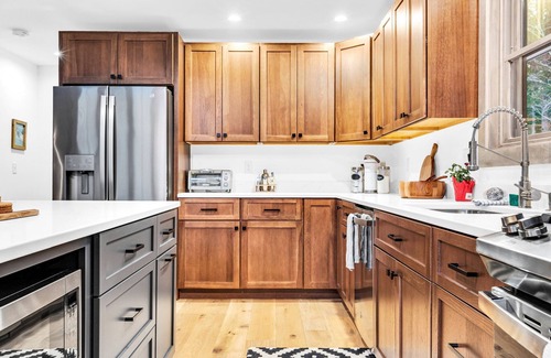 The options for outdoor leisure are endless - lounge on the porch, engage in spirited games of lawn darts or cornhole in the yard, or gather around the fire pit in comfortable Adirondack chairs, sharing stories and laughter under the star-studded sky. For those inclined to culinary delights, a gas grill is at your disposal to whip up a meal amidst this idyllic natural backdrop.