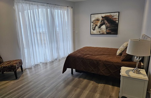 Our home is brand new featuring this suite which offers complete lower level suite in our family home. We are about a 2km. north of Summerland just off Highway 97. Access to our place is via gravel road for about 2 minutes of driving with a paved driveway and genourous parking spot on your arrival. Our home is nestled within a family owned working vineyard with views in all directions that are almost reminiscent of a French countryside. This property offers 180⁰ views of Lake Okanagan with views of Peachland to the North and the Narramata Bench across the lake and to the South the delta of Summerland. Our property is larger than most suites offer almost 1500 ft of living space. Kitchen is upgraded and perfect for your entertaining tastes. We offer two large separate bedrooms with QUEEN size beds and separate access of each room. Both rooms offer stunning views of the lake. One bedroom is complete with its own separate bathroom containing large 6 foot shower and his and hers quartz vanity sinks. It also comes with a walk in closet with more than ample storage. The other bathroom has a tub and shower combination with quartz countertops. The open concept of the living, dining and kitchen area make for perfect entertaining while enjoying the beautiful views and summer breezes. This space comes complete with deperate laundry room containing full size washer and dryer. The patio runs the whole length of the suite and accommodates a bbq, patio table and chairs and a workout machine. Come in September! It's quieter, weather is fabulous, beaches are perfect! Perfect for a small getaway or a long hiatus to enjoy all the Okanagan has to offer, we bet youcant explore it all and will be yearning to come back again.