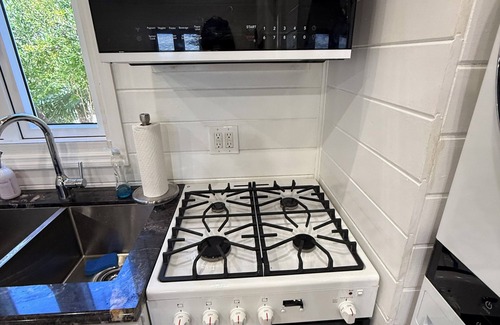 Inside, the open-concept layout features a twin-over-queen bunk bed, 55” flat-screen smart TV, high-speed WiFi, and a full kitchen complete with gas stove, microwave, refrigerator, coffee maker, and cookware. The bathroom includes a walk-in shower, and there’s a stacked washer and dryer to keep beachwear fresh.