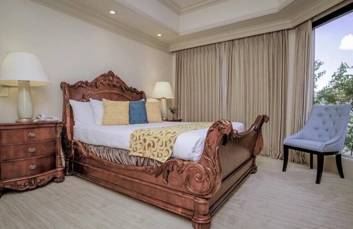 The upper level houses a library/billiard loft, another guest bedroom, an office, and the opulent master suite. This guest bedroom features a queen bed, fireplace, walk-in closet, en-suite bathroom, and exquisite woodwork. The palatial master suite entices with a fireplace, custom cabinetry, coffered ceilings, flat-screen TV, and floor-to-ceiling windows offering unparalleled views. The luxurious master bathroom, adorned with Travertine, twin sinks, European fixtures, and heated floors, creates an immersive outdoor experience with its wall of glass windows.