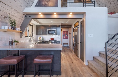 -Kitchen: Stove Top, Oven, Refrigerator, Microwave, Dishwasher, Bar Seating (seats 2)