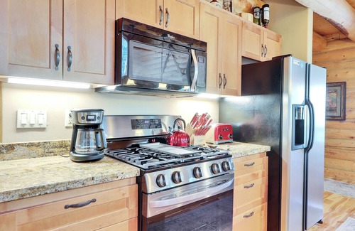 Step inside to find a spacious living area with soaring ceilings, a grand stone fireplace, and 6 flat-screen TVs, creating a warm and inviting space for relaxation. The fully loaded kitchen, equipped with modern appliances and ample counter space, is ready for your culinary adventures.