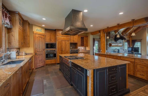 Step into style on the main level and immediately surround yourself with mountain magic. The large windows and vaulted ceilings allow for tons of natural light and an open floor plan throughout the main level. Decked out in mountain decor & style the main level living room is the perfect place to relax by the fire on the luxe leather couches and cozy up by for a movie night. From here, head into the open kitchen and dining area with ample bar seating and two dining tables. This is the ideal spot to host your entire group and come together after a fun day on the slopes. While the great room in the main living area is the social hub of the home with its huge fireplace and inviting leather furnishings, you'll find many areas to relax in throughout the home, including a second lounge with huge flatscreen TV and foosball table, quiet balconies throughout the home, reading nooks, and a wine tasting room in the wine cellar.
