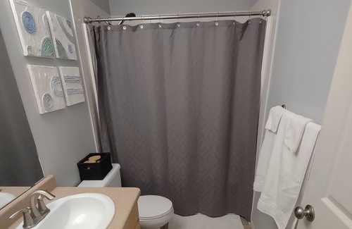The large windows make this suite very bright and cheerful feeling. Relax in the living room and watch a variety of live TV channels or login to streaming services on the 65" smart TV. Flip on the electric fireplace for an even more cozy atmosphere. A handy office area in the living room allows guests to get any work done comfortably. The large table with 6 chairs seats the whole family and the fully stocked kitchen is waiting for you to cook your favorite meal. The bathroom is fully stocked with lots of extra towels and comforts of home. Both bedrooms have comfortable beds and linens with black-out blinds, a small heater/fan and lots of storage. The Master bedroom even has a 32" TV for you to relax and watch your favorite show at the end of the day. Oh! It is pet friendly too!