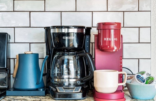 Curated spice collection, drip coffee maker, Keurig machine, and chic electric kettle for caffeine aficionados.