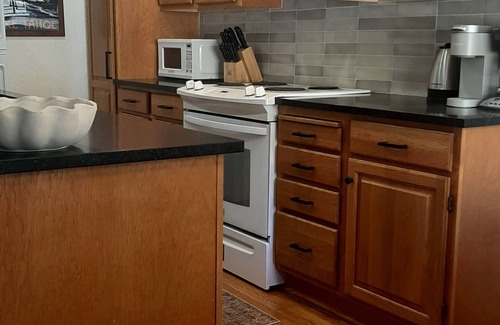 Kingswood Village 2B/2Bath well maintained end unit with lots of light, two decks, gas log fireplace, and forced gas heat. Vaulted livingroom has ceiling fan and an open floor plan to kitchen/dining. Fully stocked kitchen with new honed granite countertops and modern tile backsplash, Keurig and drip coffee machines, eat in dining area for four, plus three bar stools. Easy, no fuss keyless entry system. A close drive or walk to downtown, but just far enough to enjoy the quiet of Kingswood Village if you want to get away from the crowds! Tri-level with Private King bedroom and bathroom on lower level, Queen Sleep Number bed and bathroom in loft, and sofa bed (best for children due to comfort) on main level. Private washer/dryer. Maximum occupancy is 4 adults plus 2 children for our unit.