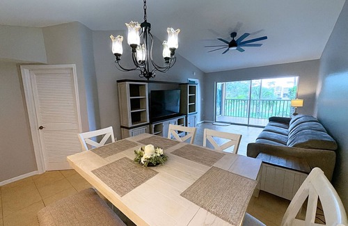 Escape to this 3BR/2BA end-unit condo -a short drive to Naples pristine beaches and the charm of Olde Naples. Enjoy serene views of a landscaped pond, perfect for morning coffee or sunset views from your private lanai. Fully furnished with brand-new decor & mattresses, this spacious retreat offers an equipped kitchen, in-unit laundry, parking & access to a shared pool. Pool has a geothermal heater/cooling compressor that heats in the winter and cools in the summer. Perfect for families, friends, couples, remote workers or extended stays seeking comfort &convenience in an unbeatable location.