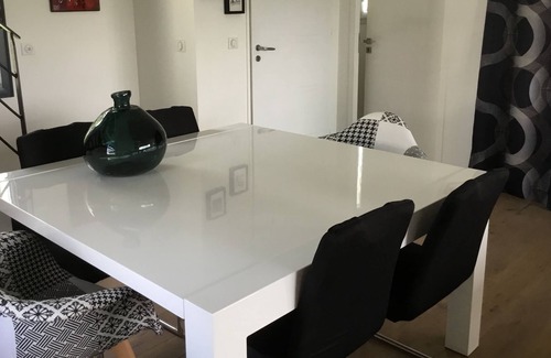 - large living room of 60 m2 with living room (TV + wifi), dining room, equipped kitchen (microwave, oven, dishwasher, fridge, coffee maker, induction hob, extractor hood).