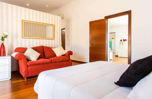 The inside of the house is consistent with regards to the aesthetics from outside. Modern, pleasantly colourful furnishing creates a very stylish atmosphere where you would like to stay immediately. Extraordinary arrangements and individual pieces give the entire ambiance an additional individual note. Live in the expansive facilities here, go back and forth between the comfortable outdoor and indoor areas as you please. You can relax perfectly on the cosy sofa in the large, light-flooded living room. A flat screen TV with satellite connection and DVD player is available for entertainment as well as a fast internet connection that ensures your digital connection to friends and families. There is a dining area between the living and kitchen area that offers an inviting, sophisticated flair for perfect meals. The kitchen is a real eye-catcher with its black-red look: you will find enough space for everything you need so there is nothing in the way of your self-catering. A bedroom and a bathroom are also located on this floor. If you take the extravagant steps up to the top floor, you will end up in a bedroom. From here you can enter the other room: a large bedroom with a walk-in closet, en-suite bathroom and private terrace. This level also houses another bathroom. All bedrooms are in an elegant style and have a lot of space. Noble bathrooms offer space for all guests and are equipped with appealing installations and fixtures. An iron and hair dryer are available in the house, so there is no need for you to bring your own from home.