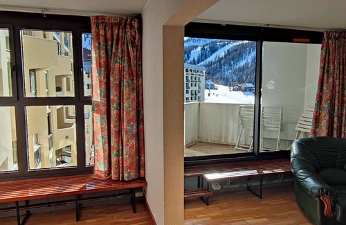 2 room apartment, located in a building in the heart of the resort in the "Front de Neige" complex (resort center), at the foot of the slopes, above the Galerie Marchande, 7th floor and close to the sports activities.
