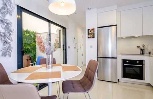 We offer for short-term rent a cozy bright apartment in a new residence with a swimming pool in an area with developed infrastructure. The 53 m2 apartment consists of a living room, two bedrooms, an American-style kitchen, a bathroom and a private courtyard. The apartment has everything you need for a comfortable stay and recreation: furniture, household appliances (including a dishwasher), dishes, linens and towels. Central air conditioning. TV Spanish, wireless Internet. The area has a well-developed infrastructure. To the supermarket "Consum" 400 meters, to "Aldi" - 500. The nearest bar is only 150 meters away. To the sea and Del Cura beach 800 meters, to Los Locos beach about a kilometer. Accommodation option - up to 4 people (strictly without animals!). Smoking is allowed only in the courtyard!