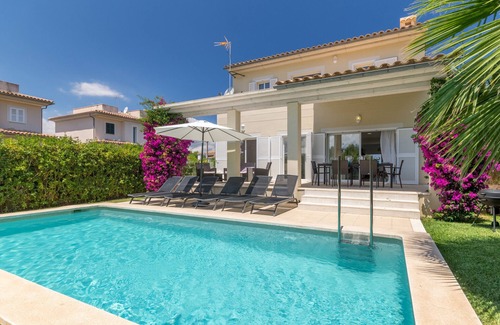 Modern family house in Barcares, for 8 persons, 4 double bedrooms, 3 bathrooms, AC, free wifi, private pool, garden with barbecue and terraces, in Barcares near AlcudiaThe cozy holiday house "Brise de Mar 2", the twin house of "Brisa de Mar 1" is located in Barcares, the extension of Alcudia, only about 200 meters from the beach, directly next to the other Villa. Barcarés is a very popular holiday area, the so-called holiday paradise for children. Eternally shallow water makes children's hearts beat faster. There is much to discover here. So scuba mask and snorkel with in the suitcases and off you go. Culture lovers prefer to stroll through the narrow streets of the old town and to indulge in local specialties in small tapas restaurants. Water sports enthusiasts can glide with their kites and surfboards through the entire "Sa Marina". A real hotspot for photographers! The old town of Alcudia and the elegant marina with a varied range of restaurants, bars and shops attract many couples and families to this beautiful holiday resort in the north of Majorca.Brisa de Mar 1 & 2 are two of our most popular vacation rentals in the area, with a quiet, yet central location near the beach, and is well-suited for all discerning travelers Relax on the pool terrace while sunbathing under Majorca's sunshine, with plenty of shade provided by a large parasol and a covered terrace by the house.Here is also the mobile grill, which is warmly welcome for culinary barbecues. There is a playground right opposite the holiday home, where your kids can let off steam.The 212m² modern interior of both houses is spread over 2 levels. The lower living area is kept open and consists of a large and very bright dining room with a long dining table, where comfortably the whole tour group can be accommodated and a cozy sofa area with satellite TV. The adjoining kitchen is super modern and equipped with a practical kitchen bar in American Style . Also from here you have direct access to the terrace. The large windows and sliding door elements let in a lot of positive daylight and create a great living environment. Before going up the stairs there are 2 double bedrooms with 2 single beds each and a bathroom in the middle which is shared here. The upper sleeping area offers 2 more large double bedrooms with double bed each. Both bedrooms have their own bathroom en suite. All bedrooms are very modern and comfortably furnished and equipped with spacious fitted wardrobes. Air conditioning is installed throughout the house. If you are traveling with babies, please let us know so we can provide you with baby cots and high chairs.You, your family and friends will feel very comfortable here. The location and facilities are really great and the best holiday weeks are sold out early every year ... We look forward to your visit!If you are looking for an accommodation for 16 people, you can rent both houses.(Mar II)
