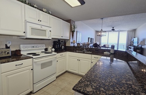 The condo amenities include WiFi, a cottage style open floor plan, sofa sleeper, 3 HDTVs with DVD players, a fully stocked kitchen with full size appliances 12-cup Coffee Maker, Mr. Coffee Keurig, Crock Pot, Electric Skillet, Blender and granite counters. The king master bedroom adjoins the balcony and has a private bathroom with a separate vanity area. There is also a queen guest bedroom with private full bath. Washer and dryer in pantry closet off the kitchen.