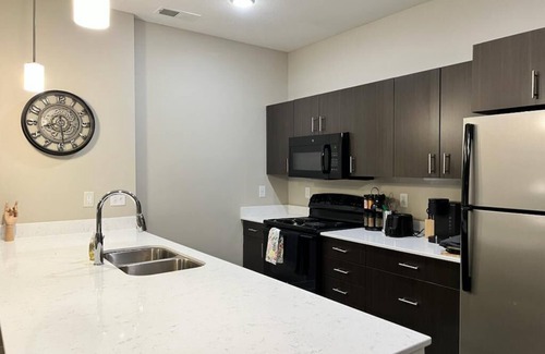 Our unit features everything you need for a comfortable stay, including a fully equipped kitchen, a cozy living room, and two bedrooms with plush beds.