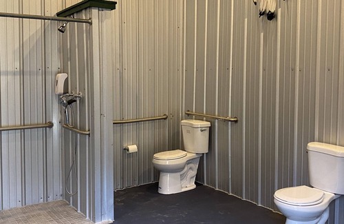Our Tipis have electricity fans and lighting comfortable beds and all you could possibly need to have a fantastic stay in our beautiful tipis. A western saloon styled bathhouse with spacious family size bathrooms is provided along with a small pond with a dock horseshoes a large firepit and more.