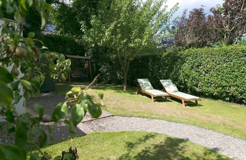 Outdoors - Large garden with fruit trees, swing seat, bench, sun loungers and picnic table. The garden is enclosed but an adventurous dog would be able to find their way out.