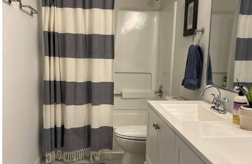 The home has three bedrooms. One has a queen bed, another a double bed with twin trundle, and the last has a convertible sofa bed. This is the flex room that could be an office, nursery, or extra full bedroom. The bathroom has double sinks. Park in the shared driveway and/or on the quiet street.