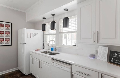Our beautifully designed, family and pet-friendly home is situated in Burlington's charming historic district, just a block from the stunning Arboretum park. The main unit of a lovingly remolded, three-unit historic home. You'll love the brilliant colors and luminous natural light, as well as the raised porch and large backyard with w/ grill, firepit, dining space and creek. Our beautiful kitchen has everything needed for cooking meals.