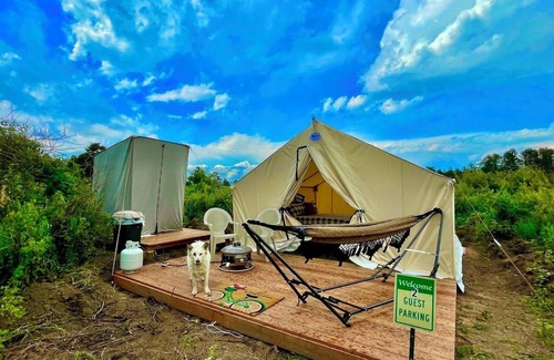 Experience rustic glamping at Butterfly, a cozy tent equipped with electricity, running water, and an outdoor tub. This charming setup includes a privacy tent with a camp commode for a true camping feel. Relax in the outdoor tub, enjoy the peaceful surroundings, and explore nearby trails and creek. Perfect for those seeking a blend of nature and comfort, Butterfly offers a unique glamping adventure just outside of town.