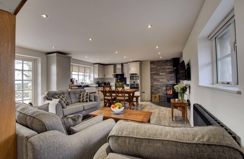 Rooms – Ground floor: open plan living room with a log burner includes a lounge, kitchen and dining area. Two steps lead up to the super-king bedroom (twin on request), double bedroom, shower room and utility room. Upstairs: Master bedroom with super-king bed and en-suite with bath and rain shower.