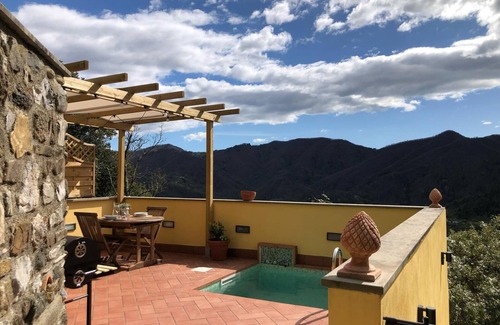 Historical stone house completely restored situated in a historical village ( Bibola-MS) on the Tuscany lunigiana hills on the external Sud side with private big terrazza with small pool inside(2,5 x 2 mt) and super view. Outside also private garden . The terrazza has a wood covered patio with all furnitures, new big sofa, table, chairs, sun loungers, barbecue.