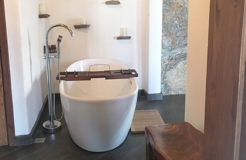 Enjoy your romantic wine country stay in this large private cabaña in the En’kanto vineyard, Valle de Guadalupe, Baja California. King sized bed, large soaking bathtub, sitting room with sofa couch and TV, mini fridge and wine/coffee area. Your personal Alexa speaker will play your choice of music, wake you when you desire, giving you the news and weather or remind you of your dinner reservation. Private patio with chiminea, and hammock. Enjoy a complimentary bottle of En kanto artisan wine with your stay! Take a stroll through the vineyards and orchard, play bocci ball or enjoy wine tasting at our wine bar. Fully air-conditioned for summer with propane fireplace for the winter.