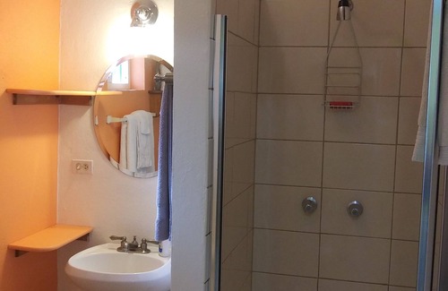 Cabana #5 is set up perfectly for a couple, and an extra person, it has a bedroom with a Queen and a twin bed and a full kitchen. We are at the end of a dead-end road, located in the center zone of Loreto. We are just a block and a half from the marina, malecon, and beach, and a very short walk to the Historical Central Plaza.