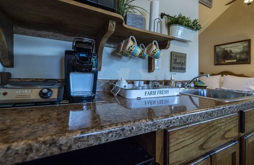 Sleeps up to 2 people only in a queen size bed. Offers a full bath with stand-up shower only, and a small kitchen with everything you need to cook a small meal (hot plate and microwave). Luxury hotel bedding, snacks, and water are included, and organic coffee is offered. Homestead Heritage is less than a mile away. No smoking and no pets allowed.