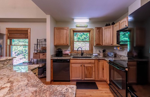 The main level has a gorgeous kitchen with hardwood cabinets and granite counters that opens to the living room. Bring your favourite coffee grounds or pods; this home has a standard coffee pot and a Keurig. Enjoy your favourite movie or game while you relax beside the gas-log fire place that starts with the push of a button. Cathedral tongue and groove ceilings let you know you are in an authentic mountain cabin.